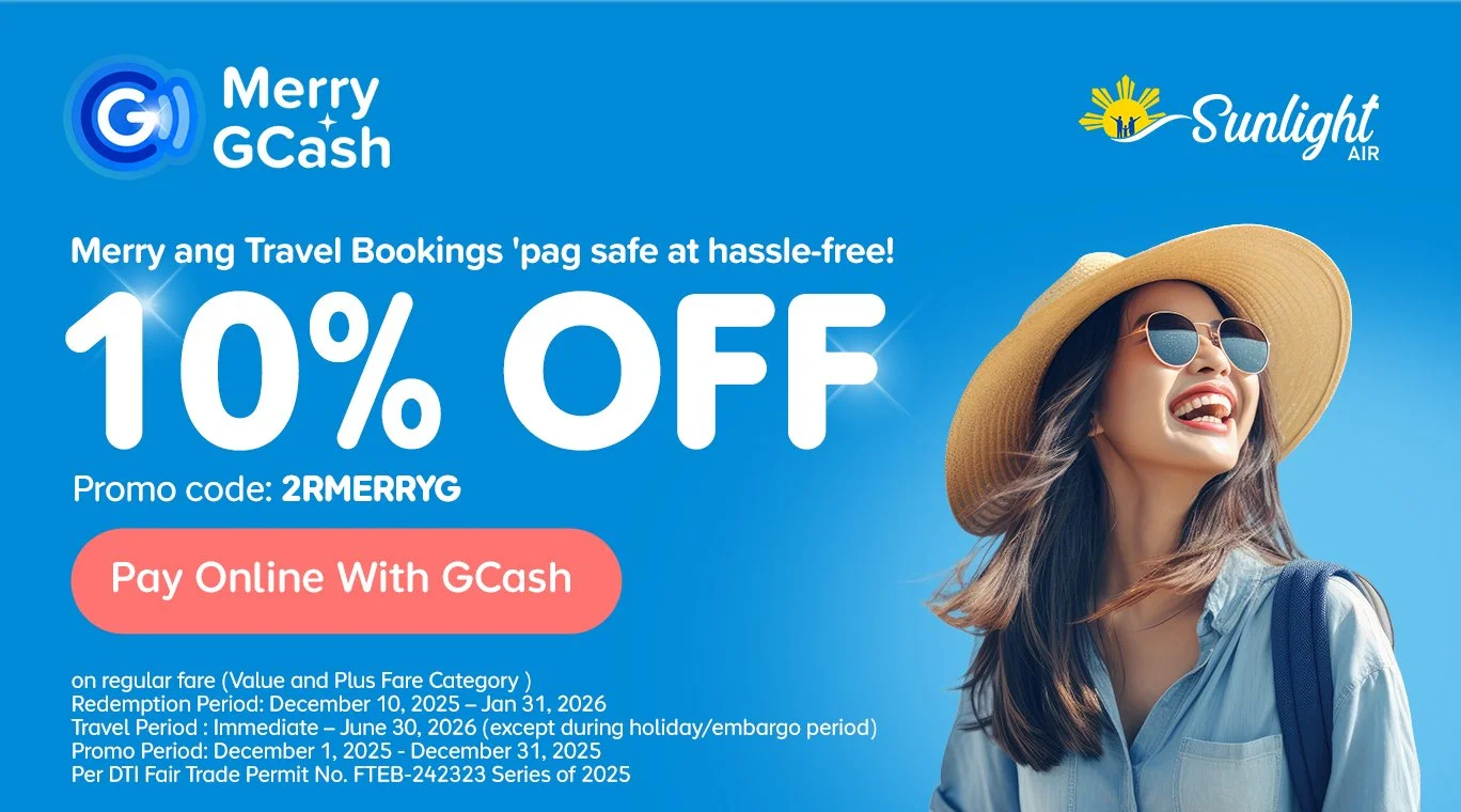 Promo Offer: Enjoy an exclusive 10% discount on regular fares (Value and Plus fare) when you book your flights with Sunlight Air using GCASH!