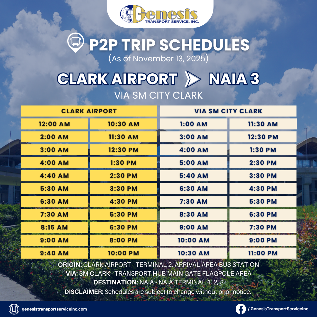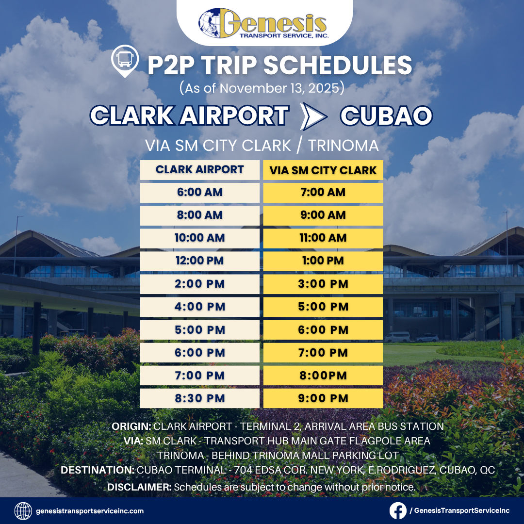 Genesis Transport offers multiple P2P routes linking Clark International Airport to Metro Manila and nearby provinces. It’s a dependable choice for both incoming and outgoing travelers.
